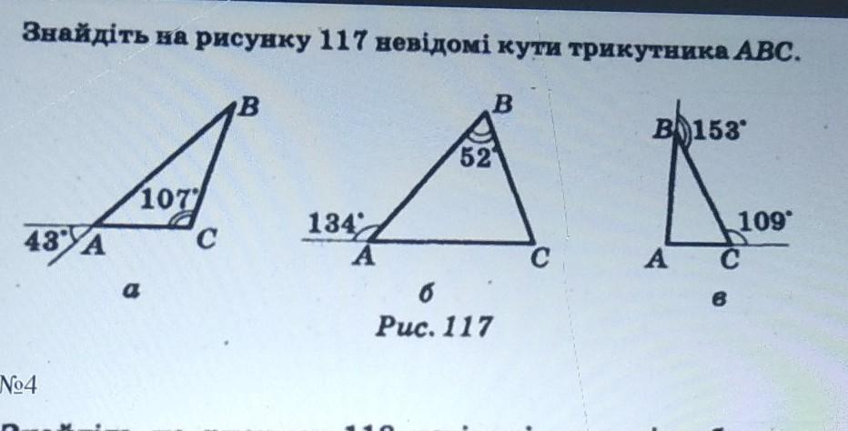 Знайдіть на малюнку 117 невідомі кути трикутника АВС