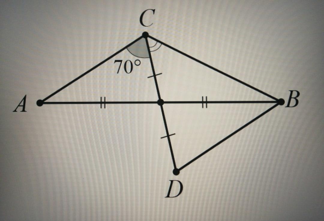 Отрезки АB и CD делят друг друга пополам точкой пересечения. Угол АСD равен 70о. Найдите угол BCD, если отрезки ВС и СD равны
