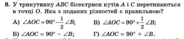 Ребята помогите пожалусто срочно.В треугольнике ABC биссектрисы углов A и C пересекаются в точке O. Какая из представленных равенств является правильным?