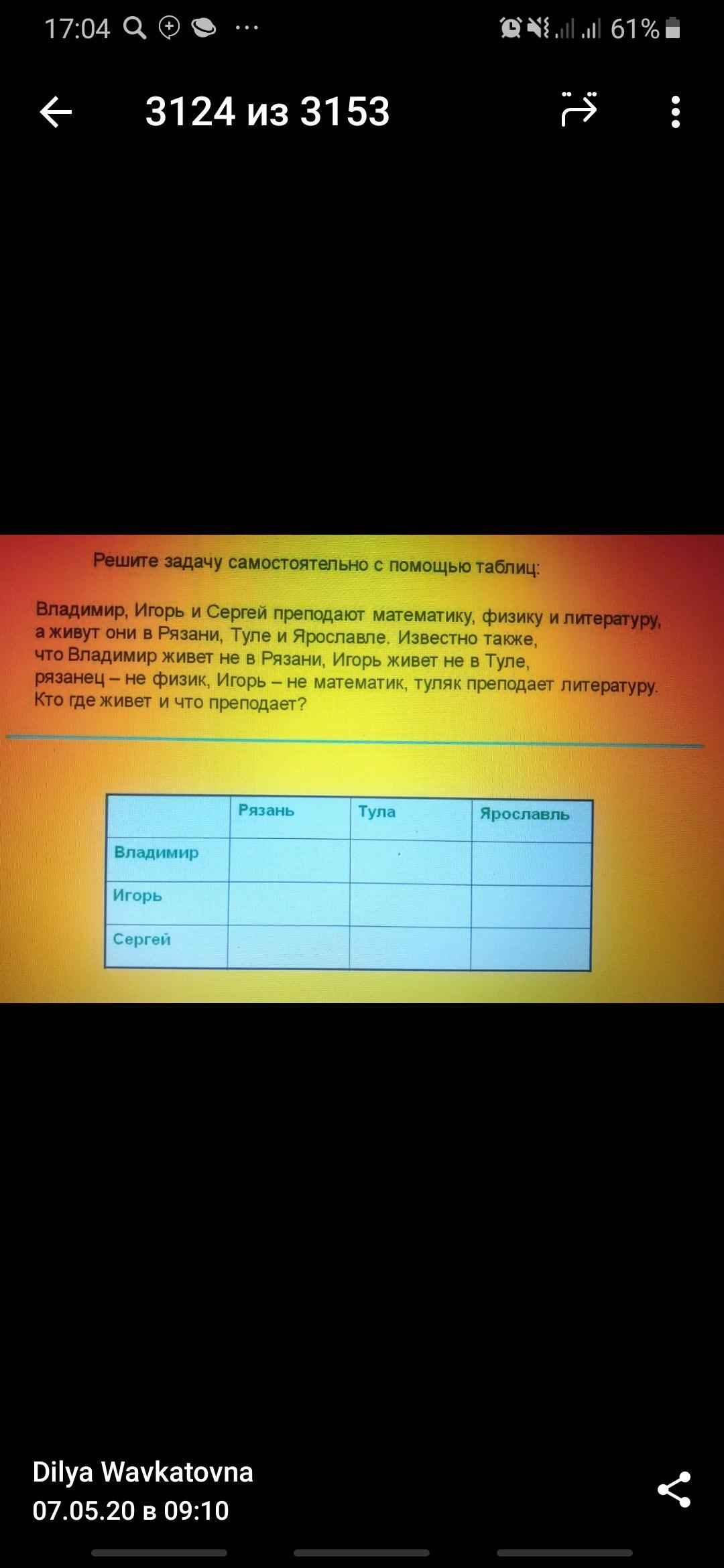 Владимир-Тула-литература, Игорь-Ярославль-физика, Сергей-Рязань-математика