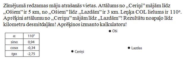 На чертеже показано расположение домов. Расстояние от дома "Сирень" до "Оши" 5 км. от .Ošiai ”до ..Lazdeš” составляет 3 км Размер угла COL составляет 110 °. Посчитайте расстояние от дома ".Ceriņi" до "Лаздай"! Результат округляется до десятых долей километра! Используйте калькулятор в расчетах!