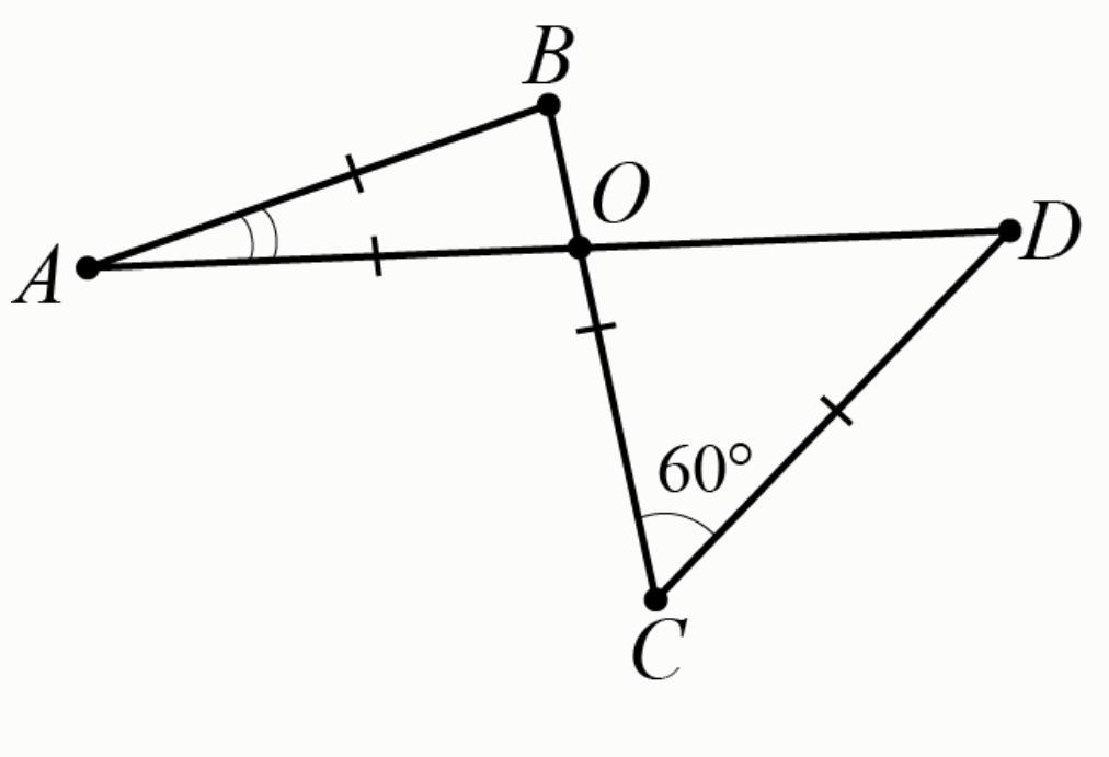 (3 балла) У замкнутой ломаной, показанной на рисунке, звенья ВС и АD пересекаются в точке О. Известно, что АО = АВ = ВС = СD, а угол ВСD равен 60о