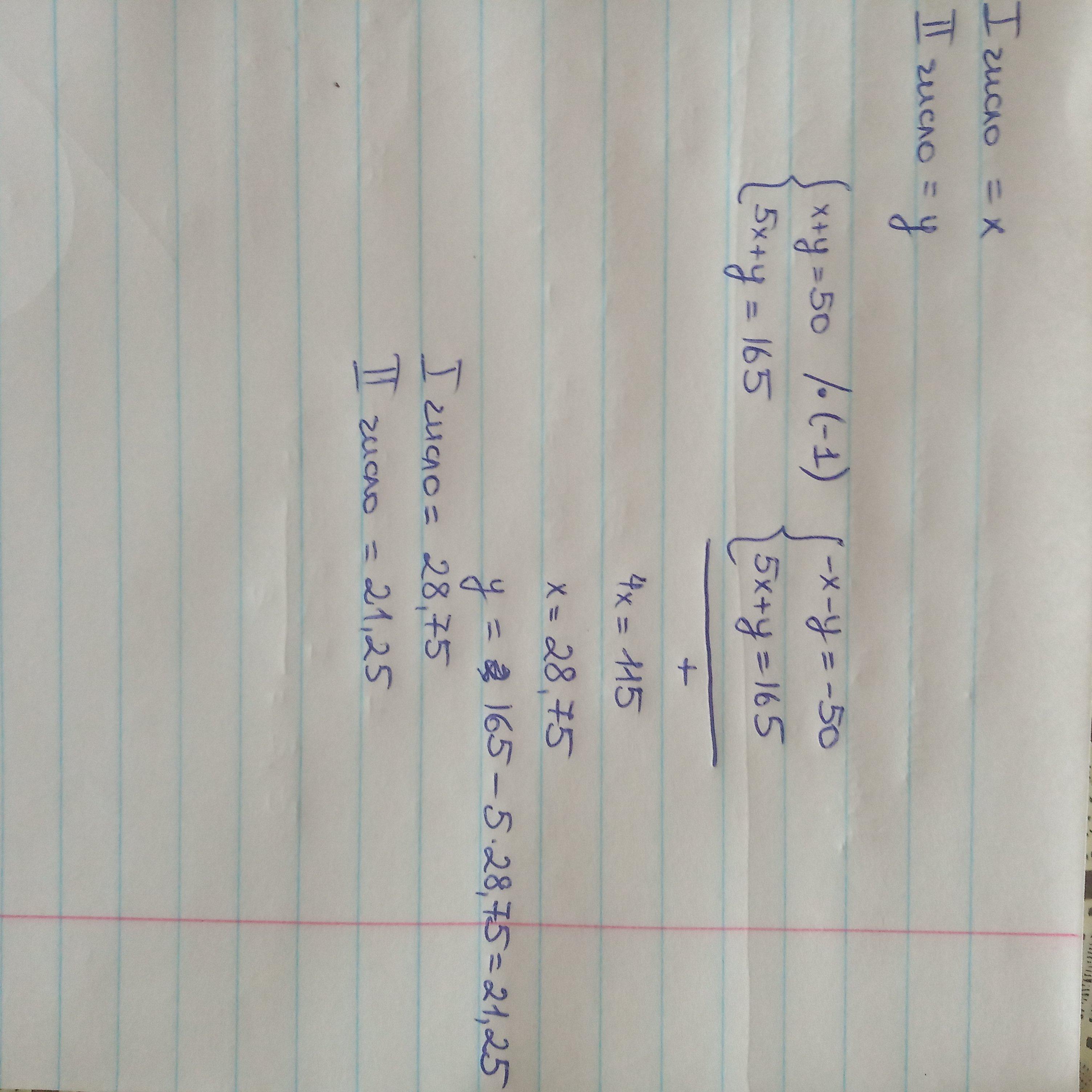сумма двух чисел 50, если первое число увеличить в 5 раз, то сумма будет 165. найдите эти числа.