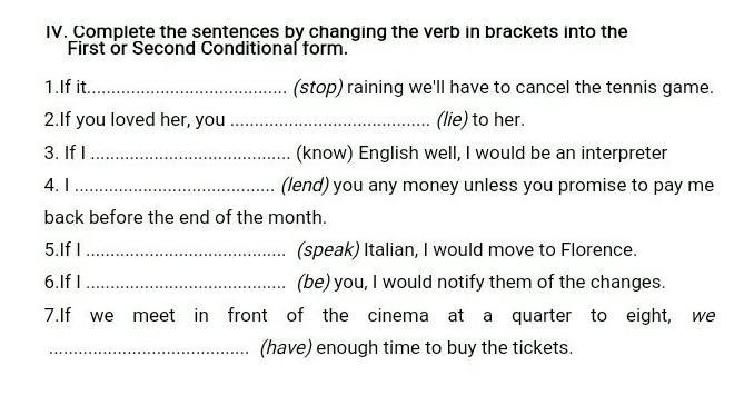 IV. Complete the sentences by changing the verb in brackets into the First or Second Conditional form.