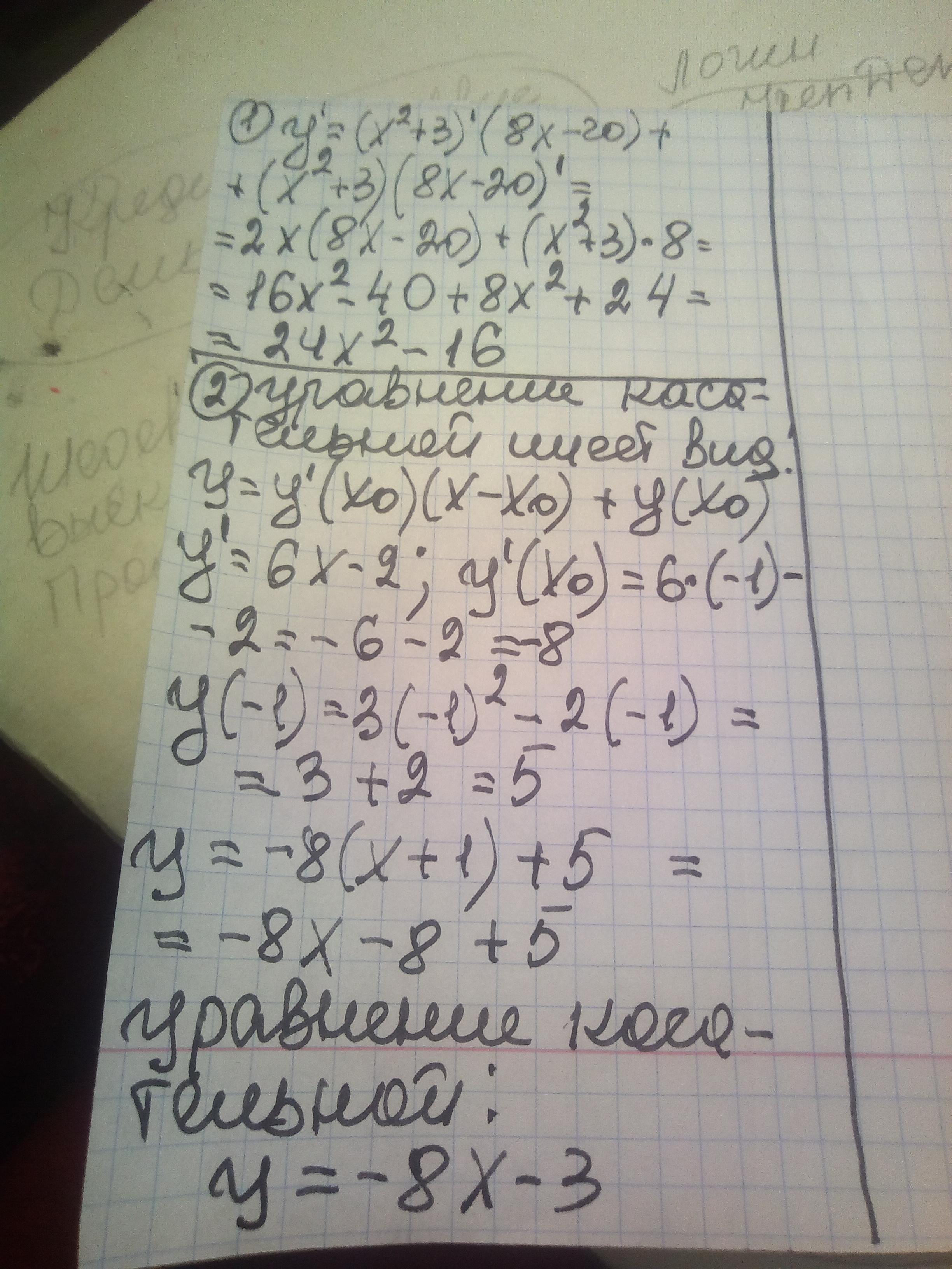 1) Знайдіть похідну функції: f(x)=(x²+3)(8x-20) f '(x)=