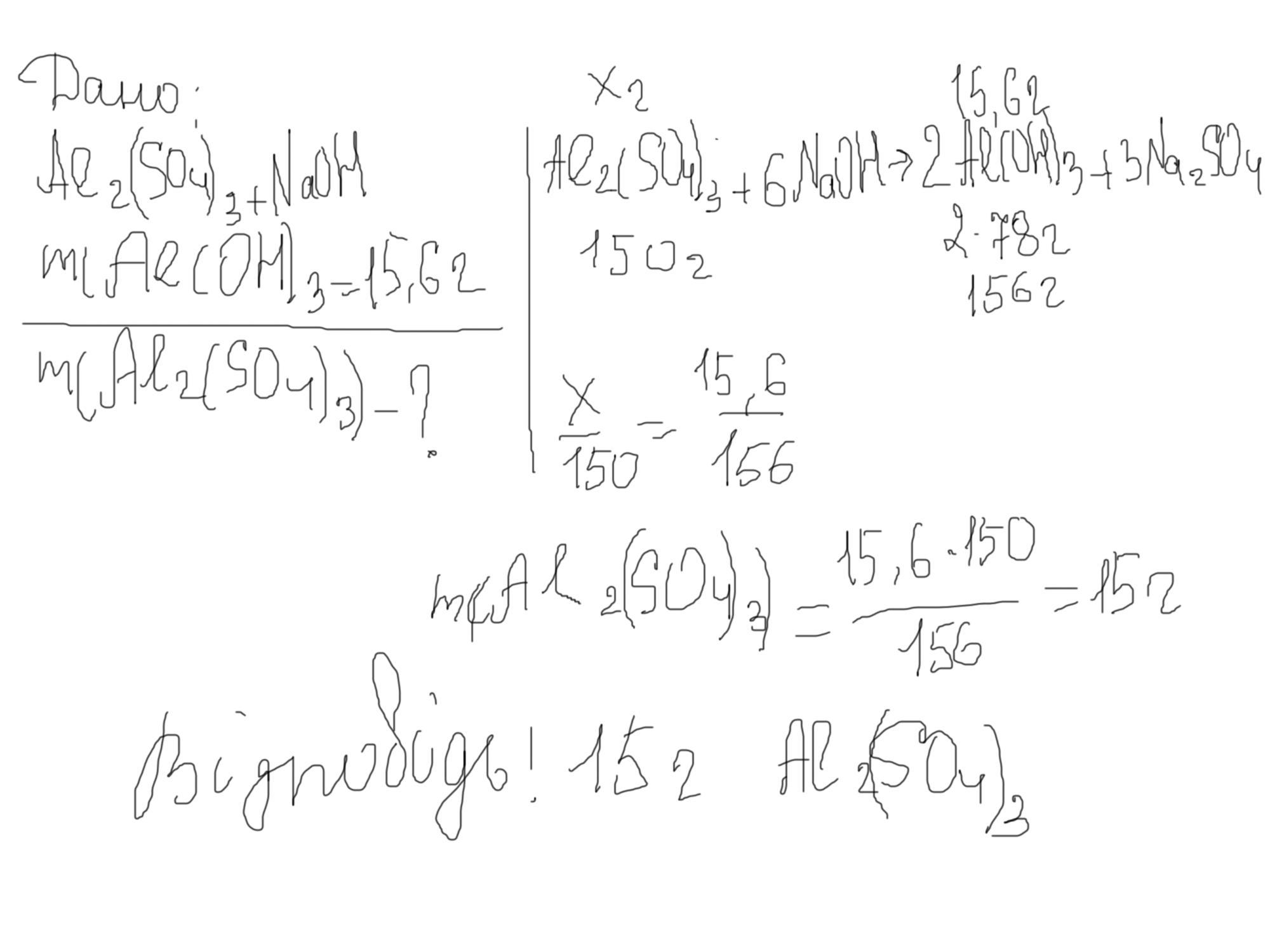Алюміній сульфат взаємодіє з натрій гідроксидом. Обчисліть, яку масу вихідної солі треба взяти, щоб добути алюміній гідроксид масою 15,6 грам?