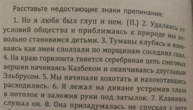 Ответ:1.Но я,любя был глуп и нем.2.Удаляясь от условий общества и приближаясь к природе, мы невольно становимся детьми.3.Туманы, клубясь и извиваясь, как змеи, сползали по морщинам соседних скал.4.На краю горизонта тянется серебряная цепь снеговых вершин, начинаясь Казбеком и оканчиваясь двуглавым Эльборусом.5.Мы начинали хохотать и, нахохотавшись, расходились.