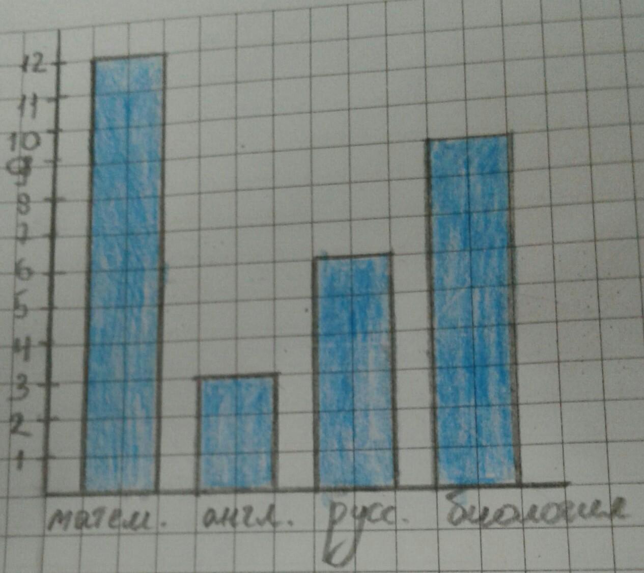 Постройте столбчатую диаграмму по следующим данным: в классе 30 учеников, из них 40% дополнительно изучают математику , 10% - английский язык , 20% - русский язык, а остальные биологию. CРОЧНО
