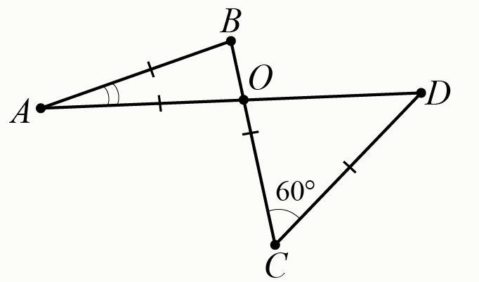 У замкнутой ломаной, показанной на рисунке, звенья ВС и АD пересекаются в точке О. Известно, что АО = АВ = ВС = СD, а угол ВСD равен 60о. Найдите угол ВАD.