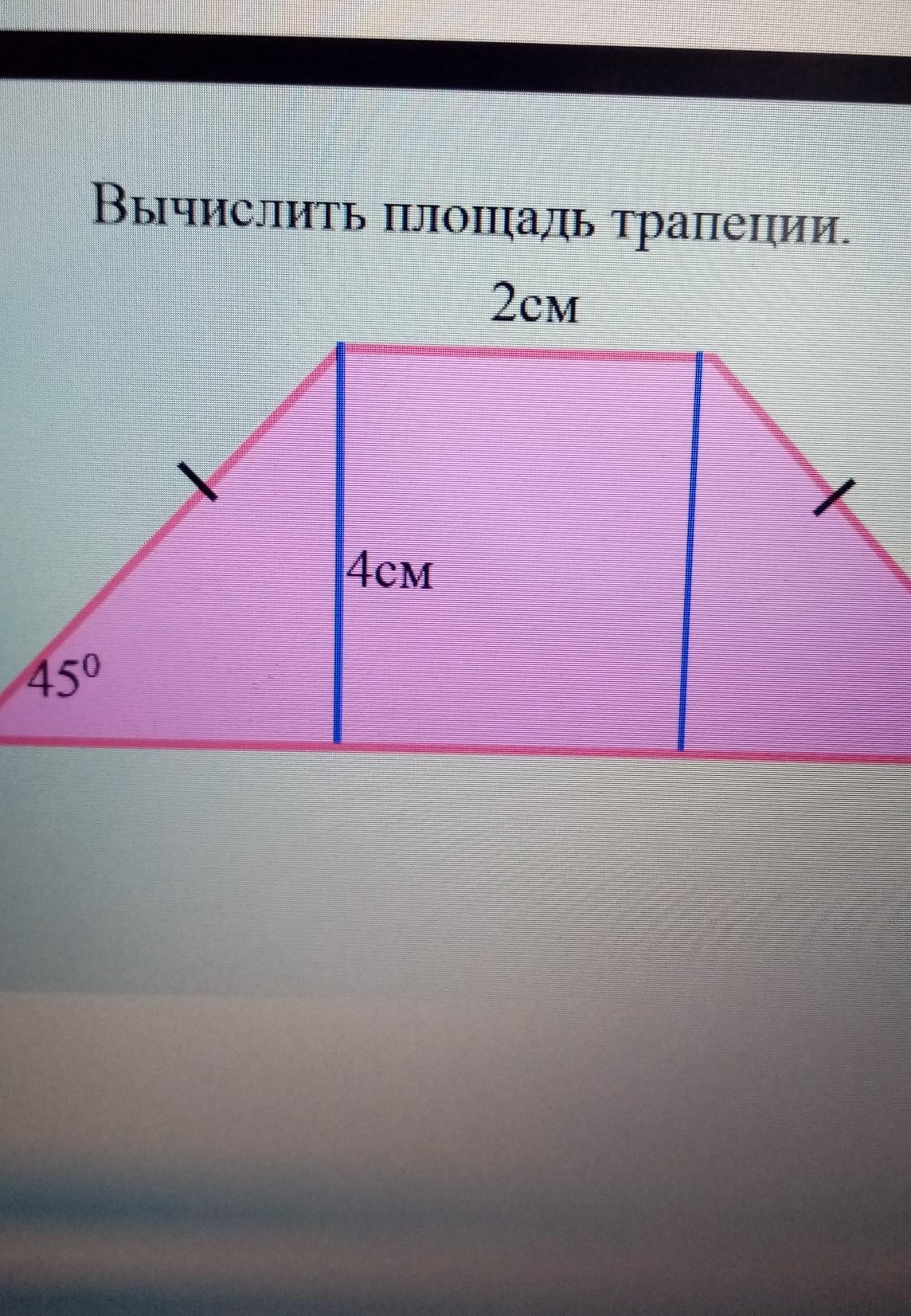 равнобедренная трапеция abcd, высота bh. рассмотрим прямоугольный треугольник abh, угол а=45º, h=90°, b=180-(45+90)=45°(т.к. сумма углов треугольника равна 180º). т.к. два угла треугольника равны между собой, то треугольник равнобедренный, катета равны между собой, ah=bh=4см. т.к. трапеция abcd- равнобедренная, то ad=2*ah+bc=2*4+2=10см. s abcd=0,5bh*(bc+ad)=2*12=24см.