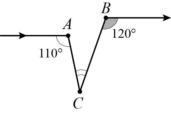 Стрелки на рисунке лежат на двух параллельных прямых. Углы с вершинами в точках А и В равны 110о и 120о. Чему равна величина угла АСВ?