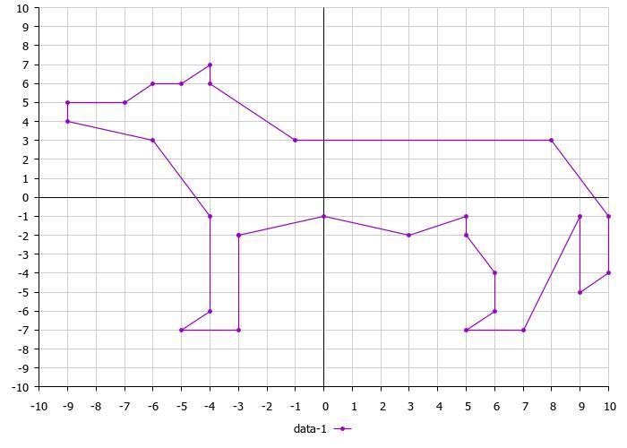 отрезками: (-3; -2) (0; -1) (3; -2) (5; -1) (5; -2) (6; -4)(6; -6) (5; -7) (7; -7) (9; -1)