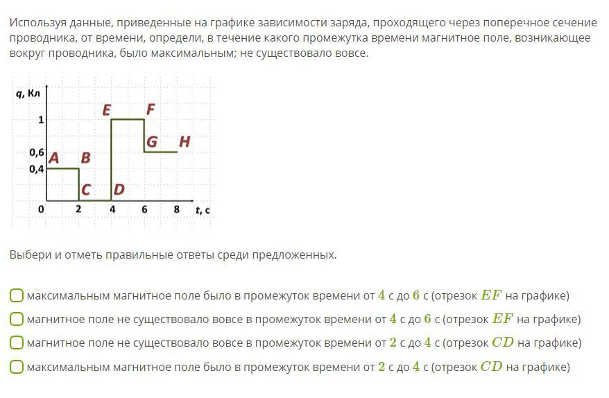 Максимальным магнитное поле было в промежуток времени от 4 с до 6 с (отрезок EF на графике)