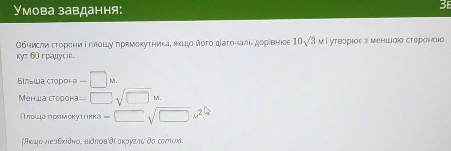 Обчисли Сторони і площу прямокутника, якщо його діагональ дорівнює 10корінь3 м і утворює з меншою стороною
