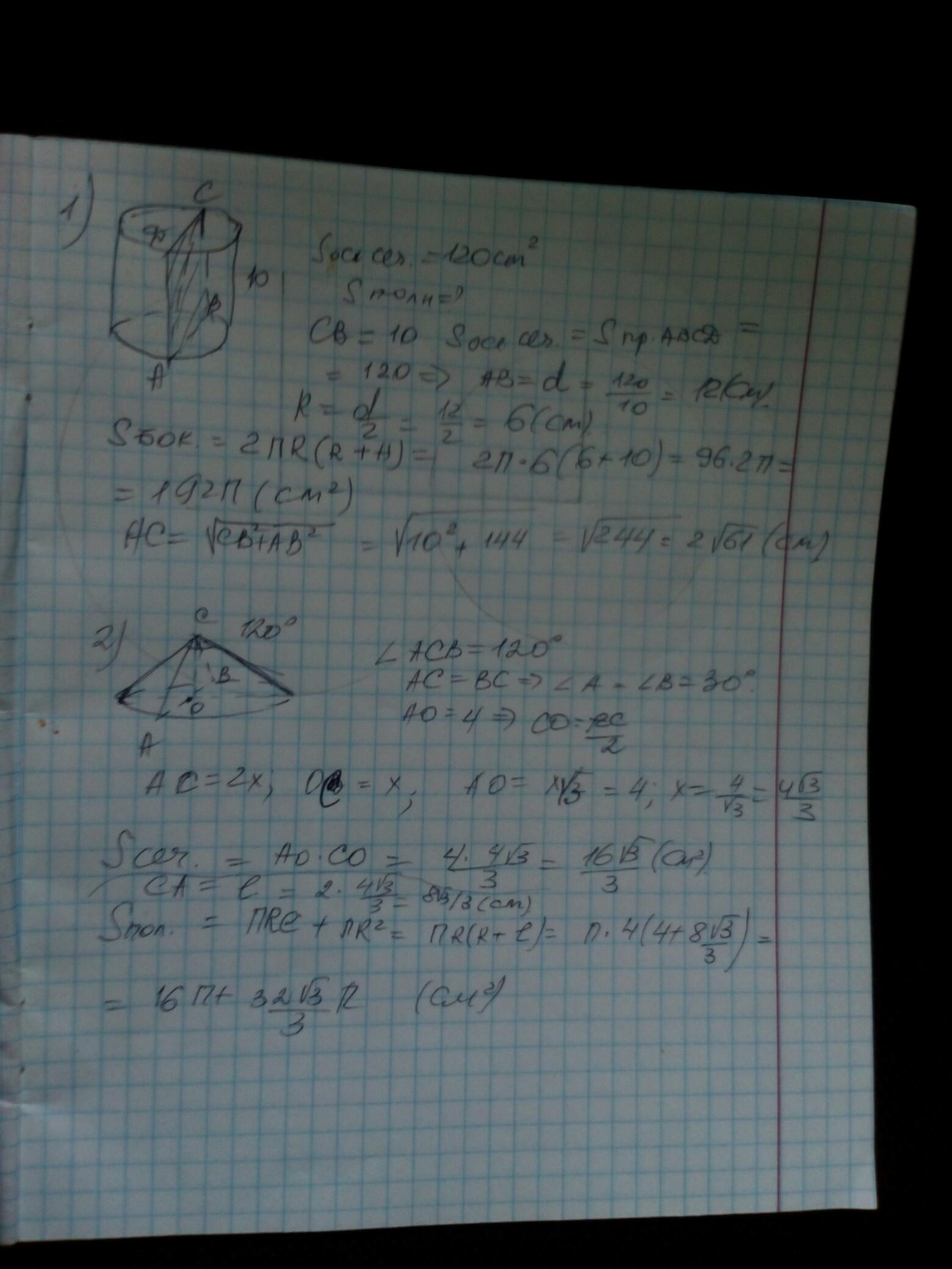 1. В цилиндре с высотой 10 см площадь осевого сечения 120 см.