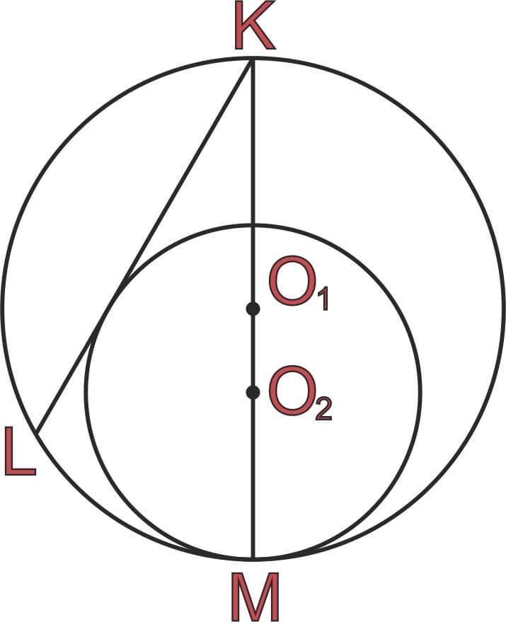 Две окружности с центрами O1 и O2 касаются внутренним образом в точке M. KL – касательная к меньшей окружности. Найдите длину KL, если радиус меньшей окружности равен 2 см и LKM=30⁰.