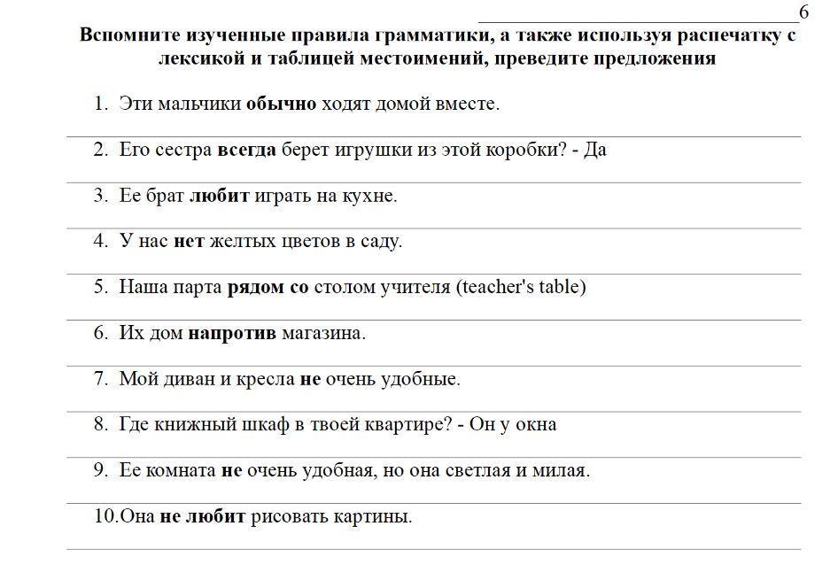 1. Повторить грамматические правила по темам: to be, have got \has got, can (темы прошлого года повторяли в сентябре, посмотрите тетрадь) и Present Simple (распечатка 2), как построить утвердительные, отрицательные и вопросительные предложения, используя эти правила. 2. Повторить слова UNIT 4 и таблицу Местоимения. 3. Выполнить Самостоятельную работу (смотри прикрепленный файл) и отправить до следующего урока. ВНИМАНИЕ! Большая просьба не использовать переводчик, т к по переводу предложений будет сразу видно и такая работа оцениваться не будет!!!