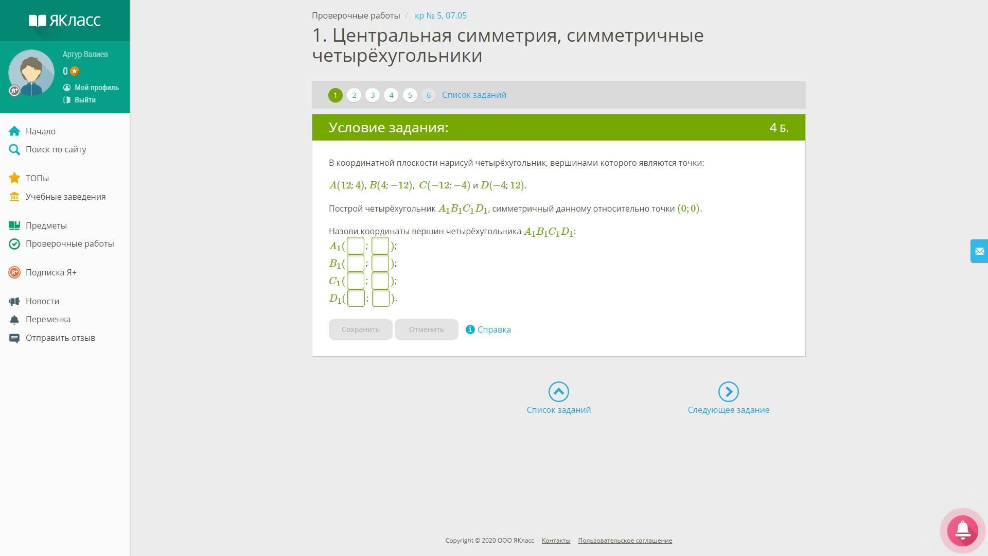Построй четырёхугольник A1B1C1D1, симметричный данному относительно точки (0;0).