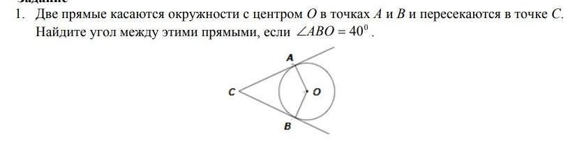 угл ABO=40 значит угл BAO=40 значит угл О=180-40-40=100(т.к.треугольник АОВ равнобедренный,а углы при основании равнобедренных треугольников равны если провести бисчектрису из угла О то получатся 2 равных прямоугольных треугольника с углами 90 и 50 следовательно углы ACO и BCO равны между собой и 40 (180-90-50=40) следовательно угл C=80
