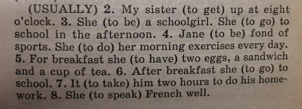 2.My sister gets up at eight o`clock. 3. She is a schoolgirl. She goes to school in the afternoon. 4. Jane is fond of sports. She does her morning exersice every day. 5. For breakfast she has two eggs, a sandwich and a cup of tea. 6. After breakfast she goes to school. 7. It takes him two hours to do his homework. 8. She speaks French well.
