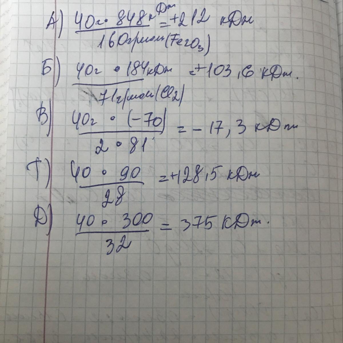 Сколько теплоты выделится или поглотится, если взяли 40 г железа оксида, хлора, бромводорода, азота, серы. Уравнения теромохимической реакции: