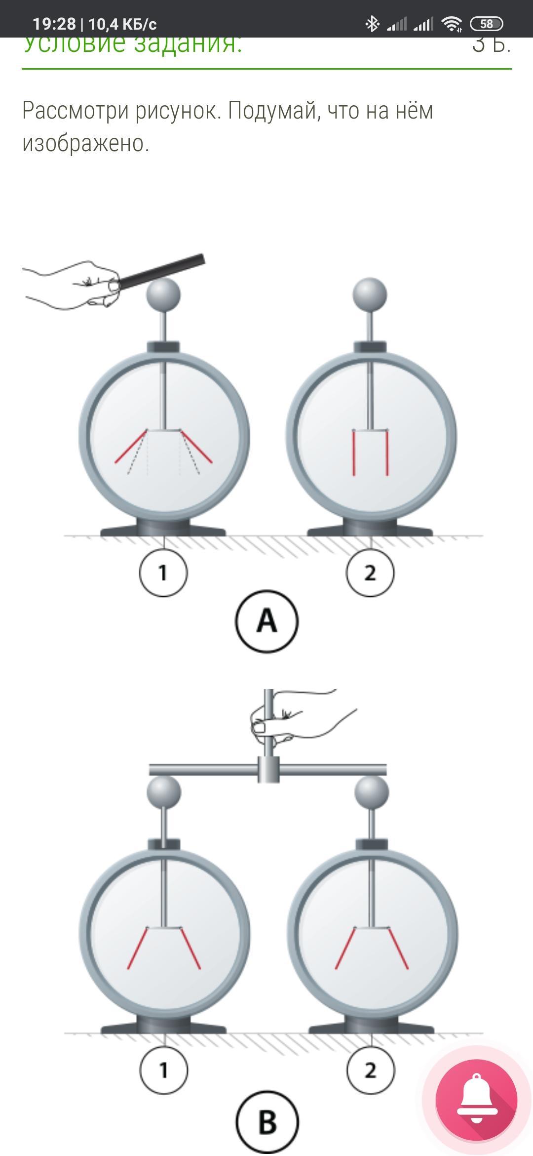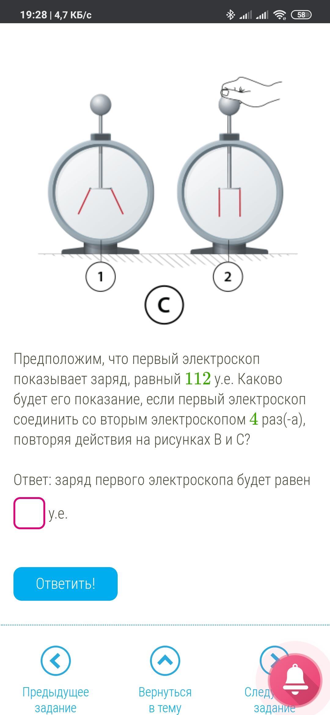 Предположим, что первый электроскоп показывает заряд, равный 112 у.е. Каково будет его показание, если первый электроскоп соединить со вторым электроскопом 4 раз(-а), повторяя действия на рисунках B и C?