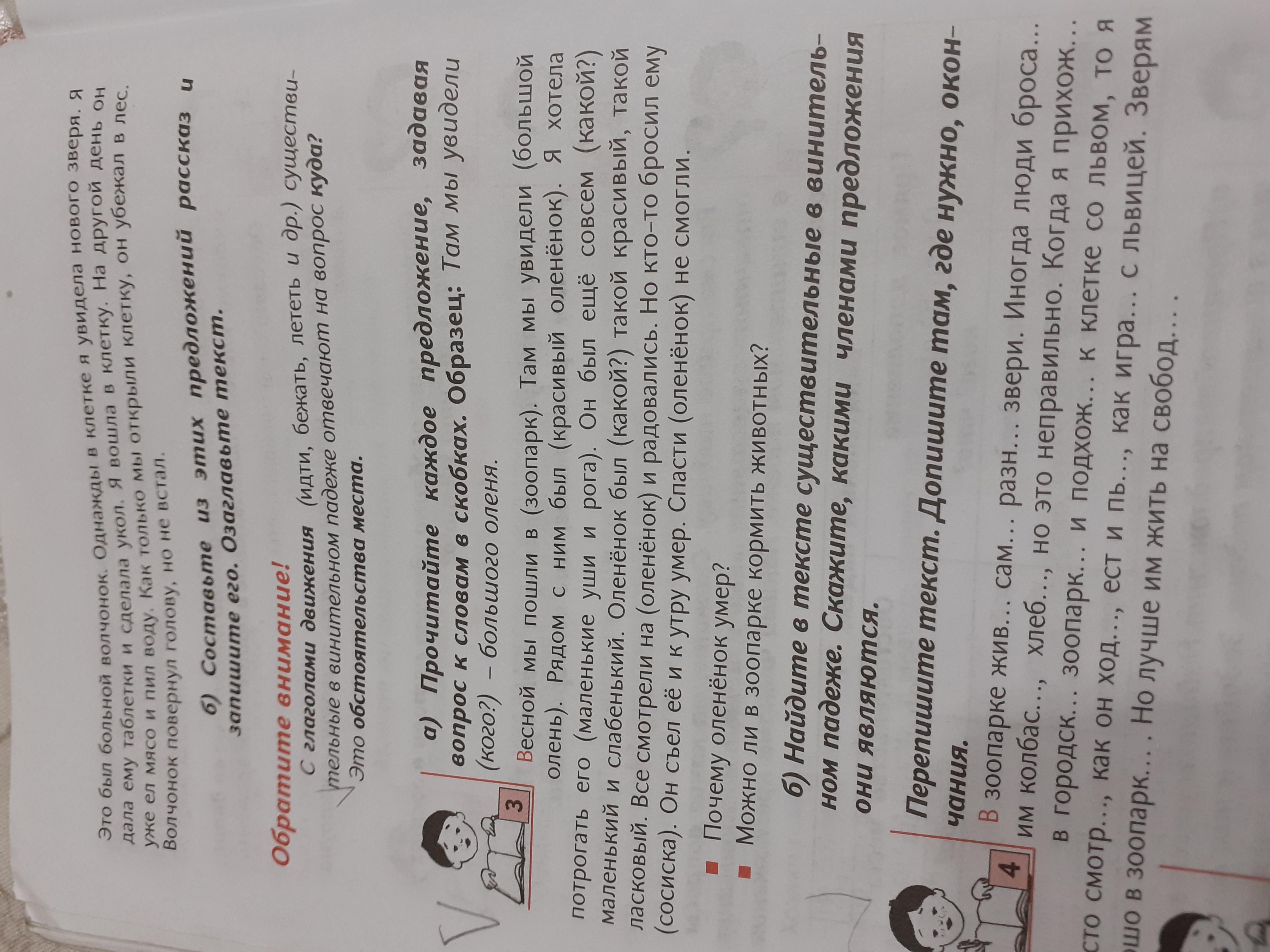 Весной мы пошли (куда?) - в зоопарк. Там мы увидели (кого?) - большого оленя. Рядом с ним был (кто?) - красивый оленёнок. Я хотела потрогать его (что?) - маленькие уши и рога. Все смотрели (на кого?) - на оленёнка и радовались. Но кто-то бросил ему (что?) - сосиску. Спасти (кого?) - оленёнка не смогли. ( Писала предложения где не было вопросов)
