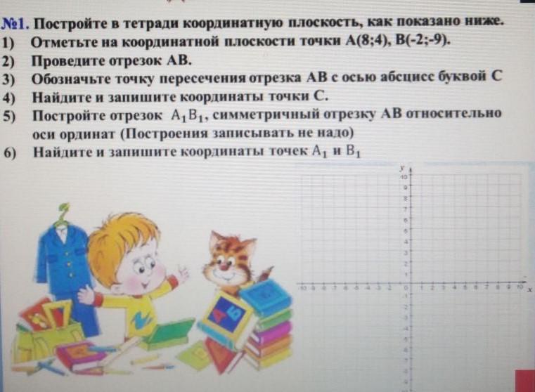 1)Отметьте на координатной плоскости точки А(8;4), В(-2;-9). 2) Проведите отрезок А В. 3) Обозначьте точку пересечения отрезка АВ с осью абсцисс буквой С. 4) Найдите и запишите координаты точки С. 5) Постройте отрезок А1 В1 , симметричный отрезку АВ относительно оси ординат. 6) Найдите и запишите координаты точек А1 и В1.