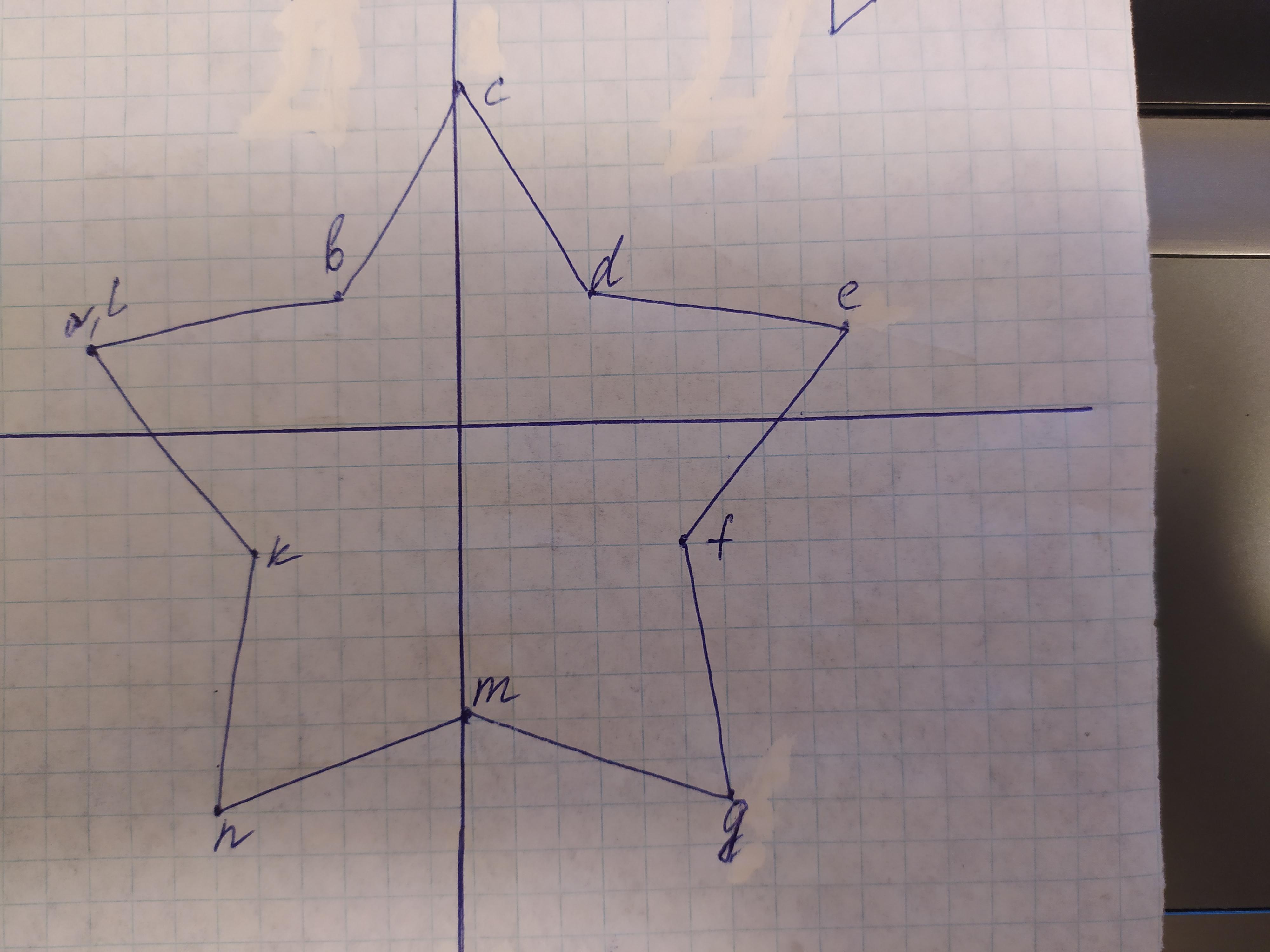 на координатной плоскости постройте точки по их координатам и последовательно соидените их a(-9;2) b(-3;3) c(0:8) d(3;3) e(9;2) f(5;-3) g(6;-9) m(0;-7) n (-6;-9) k(-5;-3) l(-9;2)