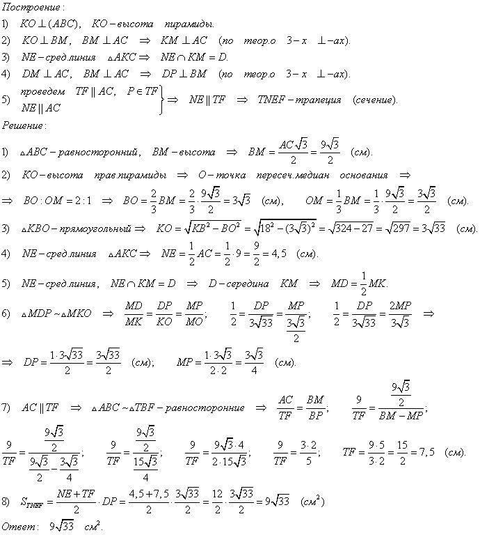 В правильной треугольной пирамиде сторона основания равна 9 см боковое ребро 18 см. Найдите площадь сечения проведенного через середины двух смежных боковых реббер перпендикулярно основанию пирамиды....