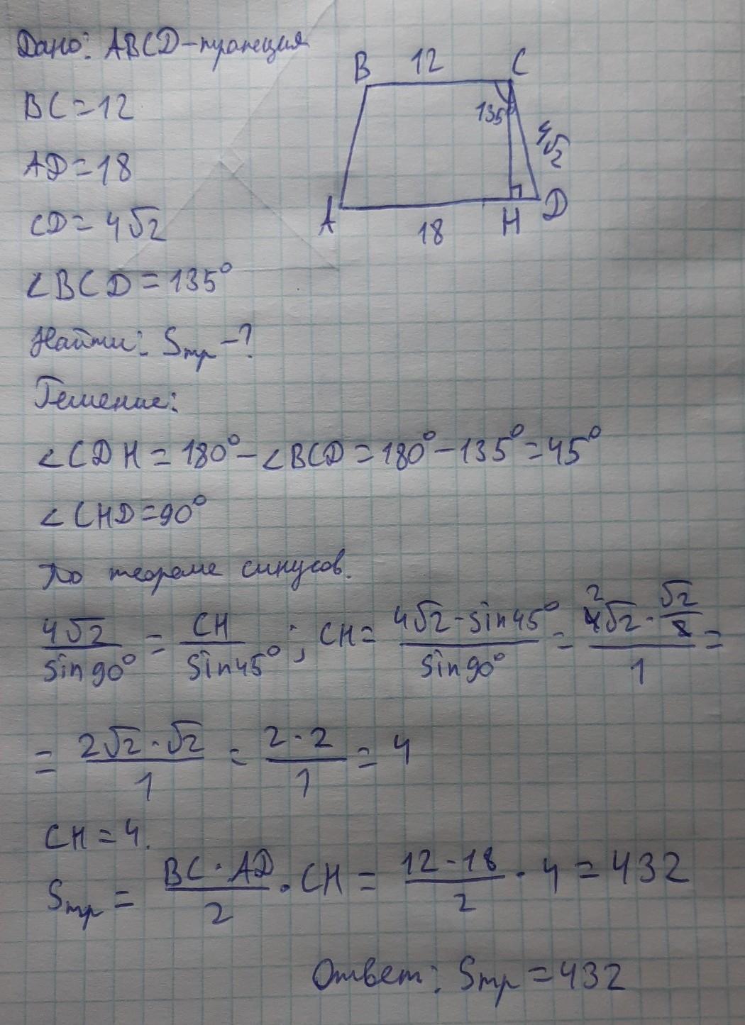 Основания трапеции равны 18 и 12, одна из боковых сторон равна 4корень2, а угол между ней и одним из оснований равен 135(градусов). Найдите площадь трапеции.