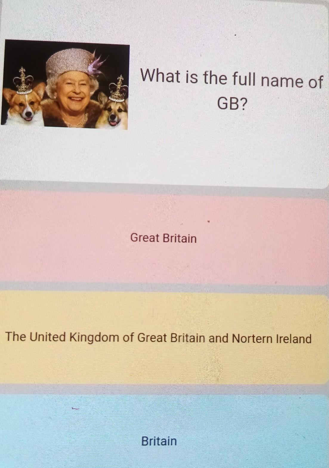 Объяснение: Настоящее имя -Great Britain и возможно Britain .Потому что The United Kingdom of Great Britain and Northern Ireland-Великобритания)