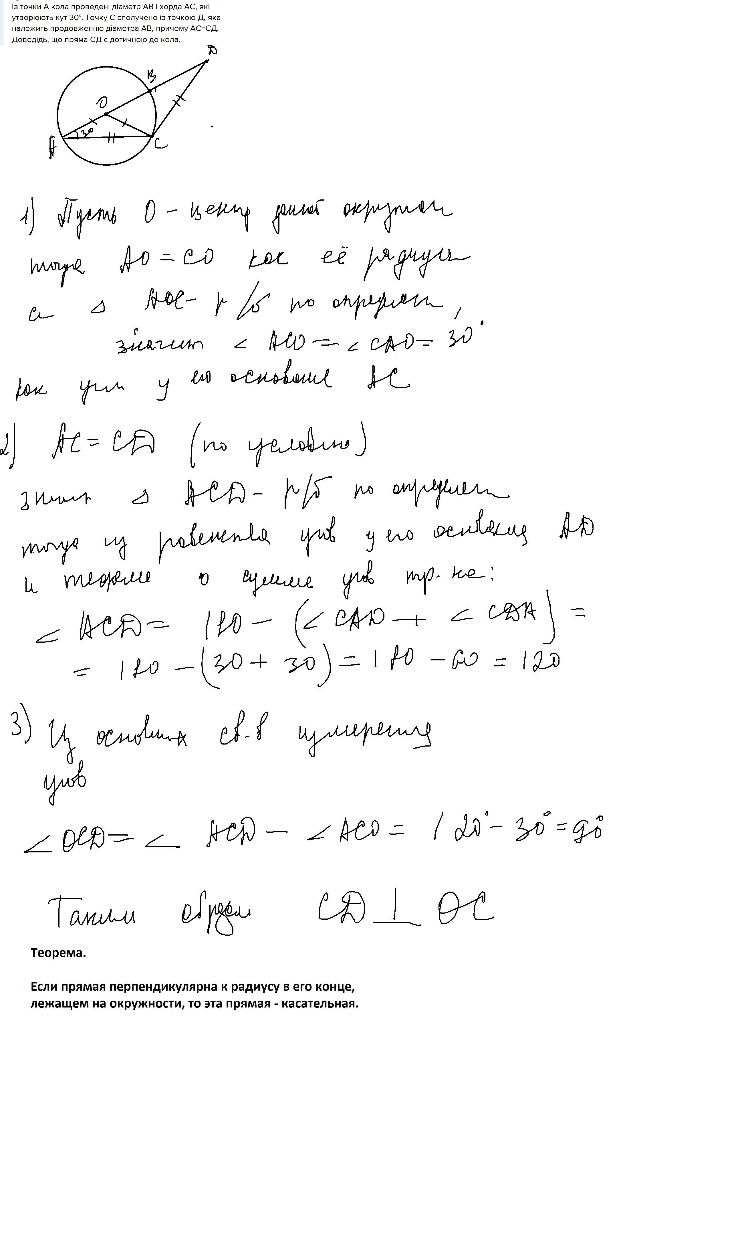 Із точки А кола проведені діаметр АВ і хорда АС, які утворюють кут 30°. Точку С сполучено із точкою Д, яка належить продовженню діаметра АВ, причому АС=СД. Доведідь, що пряма СД є дотичною до кола.