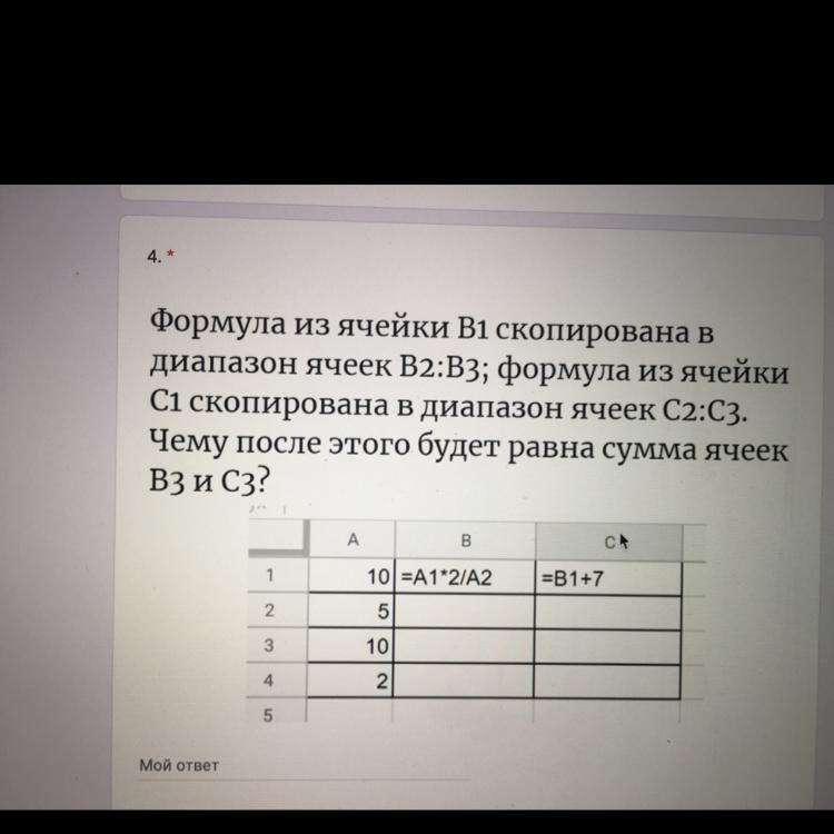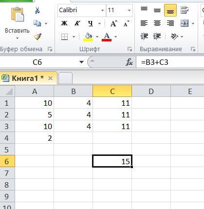 Вот, также ввел данные, вставил формулы, и в выделенную ячейку вывел сумму В3 и С3. Ответ - 15.