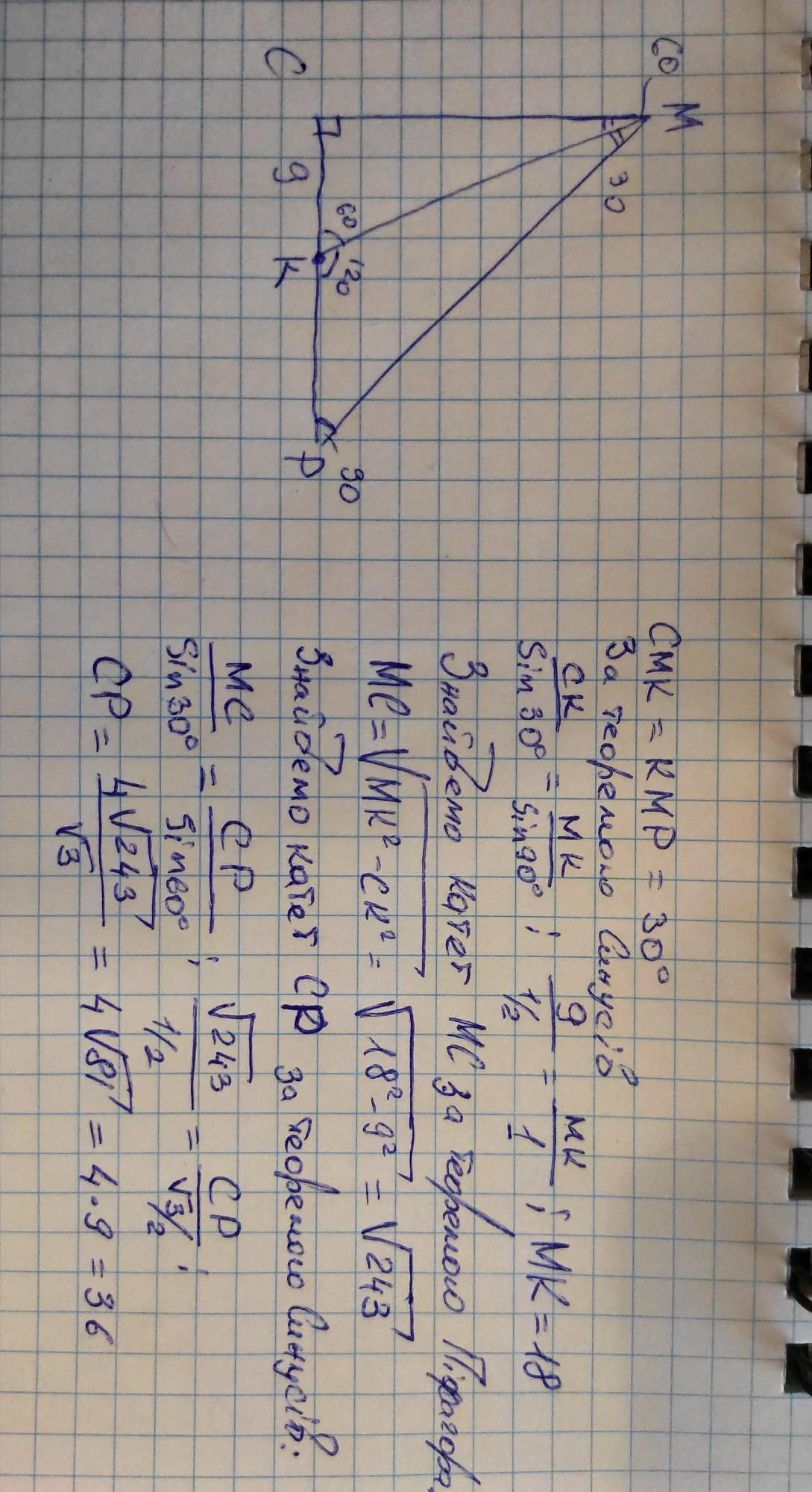 у прямокутному трикутнику MCP Кут С 90 градусов МК биссектриса трикутника Кут СМР 60 градусов знайдить довжину какета СР якщо СК дорівнює 9 см