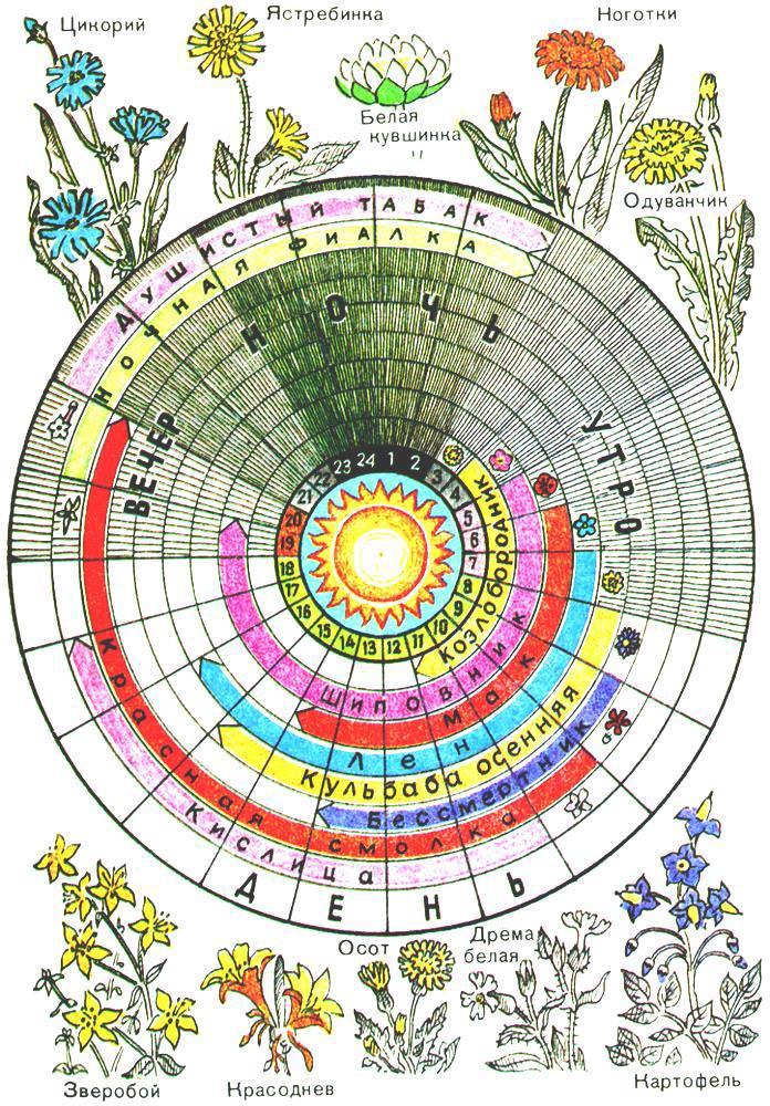 Если ты понаблюдаешь за растениями, то заметишь, что одни цветки являются вестниками восходящего, а другие – вестниками заходящего солнца. Изучи рисунок «Цветочные часы» и выполни задание.Какое растение цветёт продолжительнее всех?