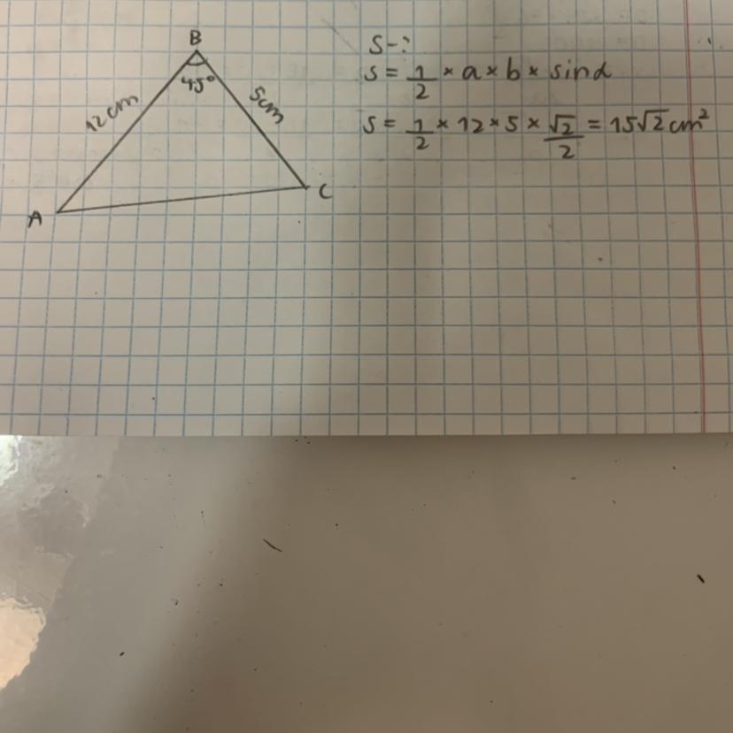 Знайдіть площу трикутника, сторони якого 5 см і 12 см, а кут між ними 45°. Пожалуста