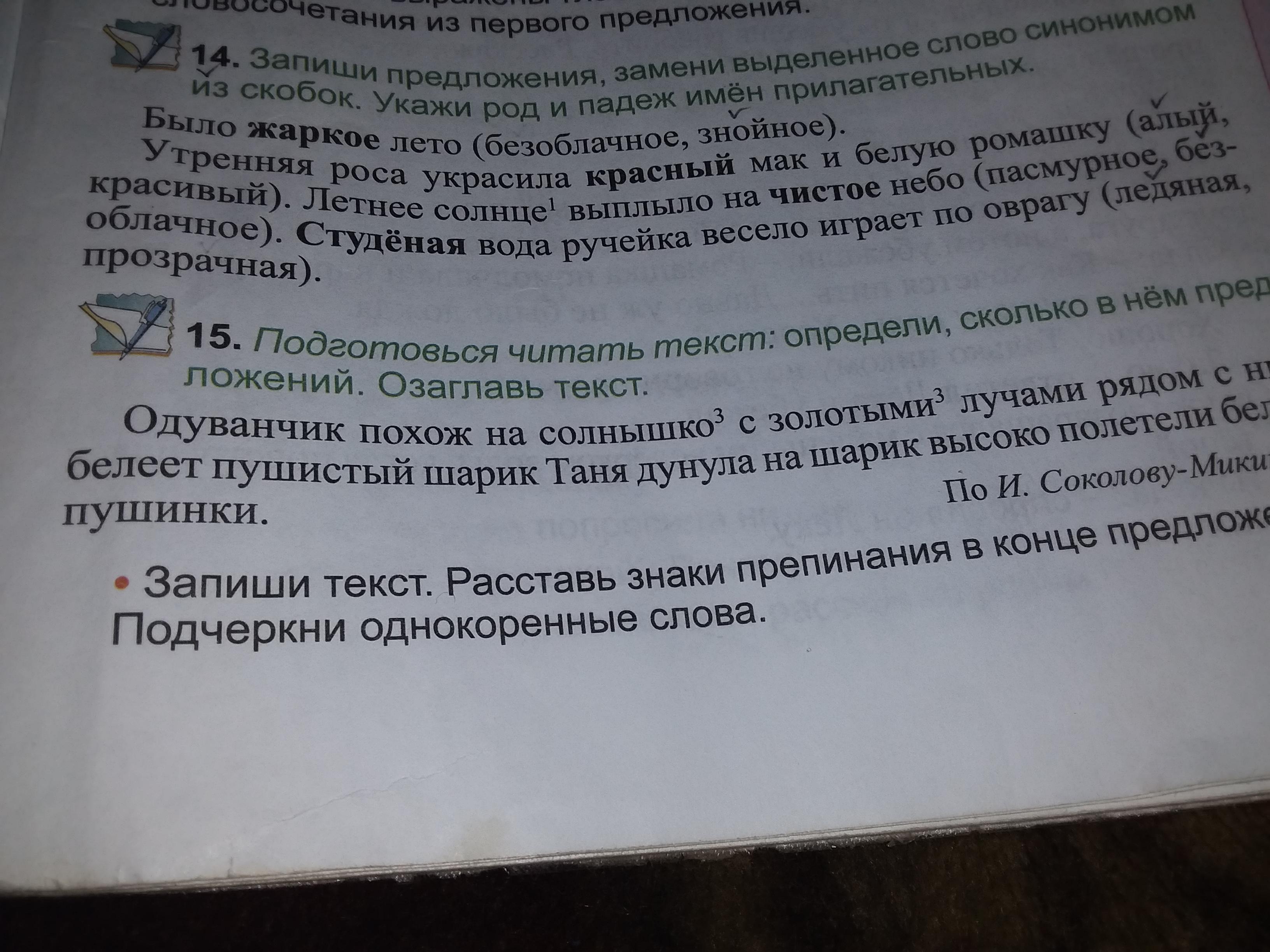 15. Одуванчик похож на солнышко с золотыми лучами. Рядом с ним белеет пушистый шарик. Таня дунула на шарик. Высоко полетели белые пушинки.