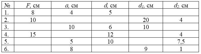 На розсіювальну лінзу діаметром d падає паралельний пучок променів, який після заломлення утворює на екрані, що розташований від лінзи на відстані a, круг діаметром d1. Якщо на місце розсіювальної лінзи поставити збірну такого ж діаметра, то на екрані утвориться круг діаметром d2. Використовуючи дані, наведені в таблиці, визначити невідомі величини у варіанті, вказаному вчителем, якщо фокусні відстані F обох лінз однакові за модулем.