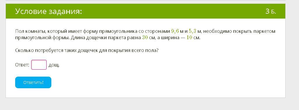 Пол комнаты, который имеет форму прямоугольника со сторонами 9,6 м и 5,3 м, необходимо покрыть паркетом прямоугольной формы. Длина дощечки паркета равна 30 см, а ширина — 10 см.