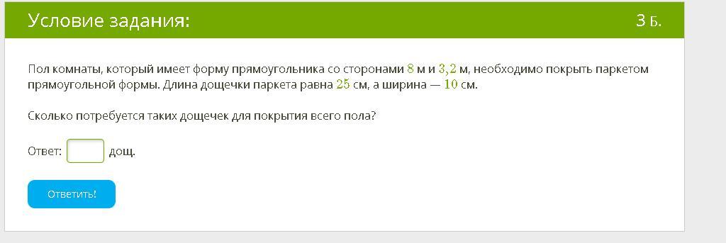 Пол комнаты, который имеет форму прямоугольника со сторонами 8 м и 3,2 м, необходимо покрыть паркетом прямоугольной формы. Длина дощечки паркета равна 25 см, а ширина — 10 см.