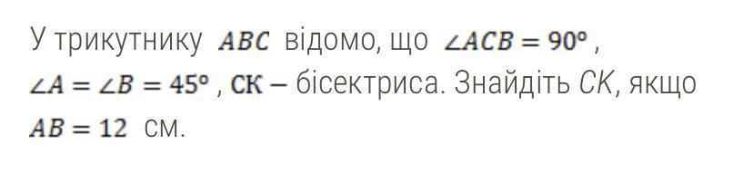 Треугольник АВС прямоугольный равнобедренный, т.к. угол АСВ = 90°, а острые углы равны. Следовательно, основание равнобедренного треугольника - это АВ. Если СК - биссектриса, проведённая в равнобедренном треугольнике к его основанию, то она и мединана (это свойство медианы в р/б треугольнике).