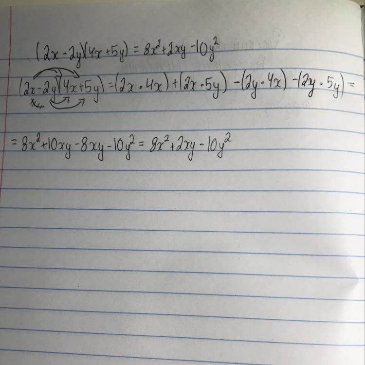 (2x-2y)(4x+5y)=( 2x ·4x)+(2x·5y) -(2y·4x) -(2y·5y) =8x²+10xy-8xy-10y²=