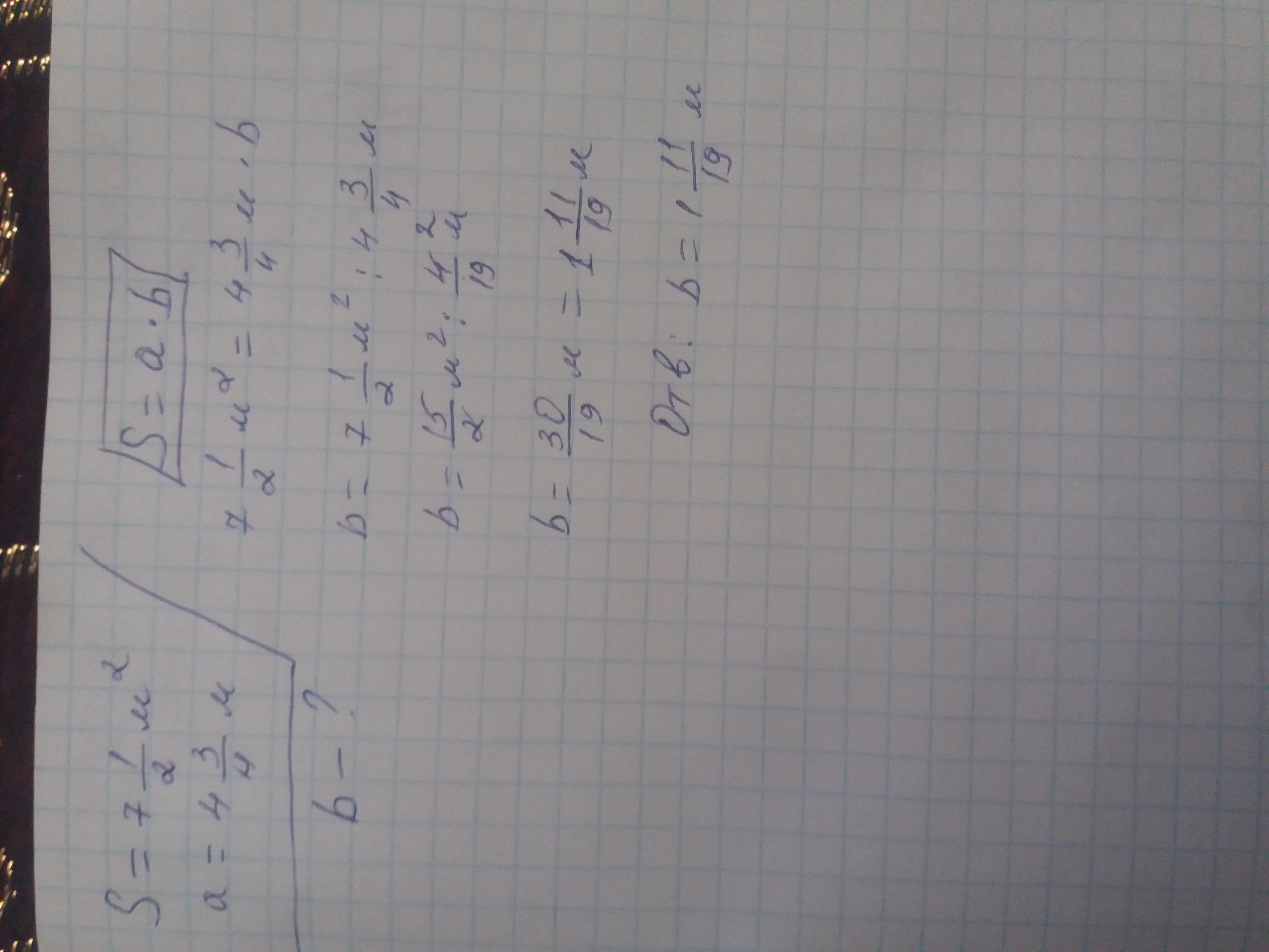 площадь прямоугольника 7 1/2 м²(смешанная дробь), а длина 4 3/4 м. Найти его ширину.