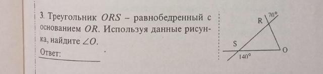 Треугольник ORS - равнобедренный с основанием OR. Используя данные рисунка, найдите ∠О.