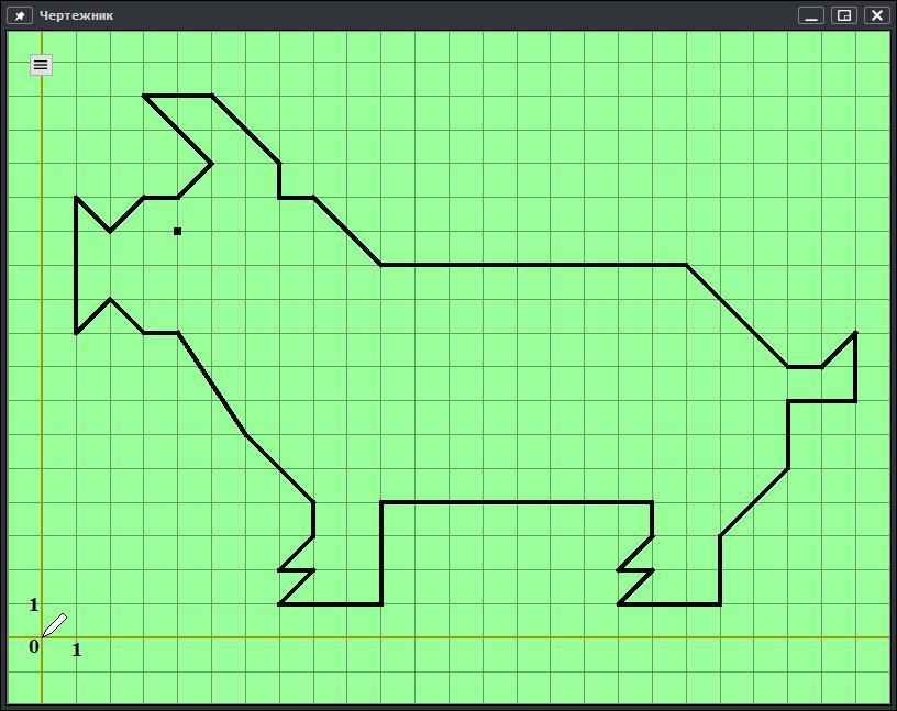 Координатный рисунок (1,13), (2,12), (3,13), (4,13), (5,14), (3,16), (5,16), (7,14),(7,13), (8,13), (10,11), (19,11), (22,8), (23,8), (24,9), (24,7),(22,7), (22,5), (20,3), (20,1), (17,1), (18,2), (17,2),(18,3), (18,4), (10,4), (10,1), (7,1), (8,2), (7,2),(8,3), (8,4), (6,6), (4,9), (3,9), (2,10), (1,9), (1,13).
