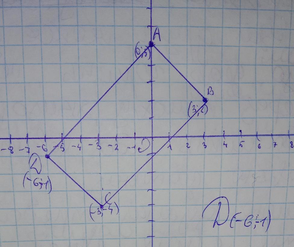 Постройте в координатной плоскости параллелограмм с вершинами в точках А(0;5), B(3:2), C(-3;-4). Определите