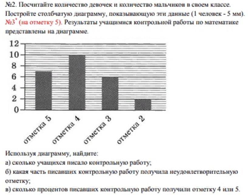 номер 2. Это ты считаешь сколько у тебя человек в классе у меня 9 девочек и 11 мальчиков в классе. И делаешь точно такую же диаграмму как в номере 3 только меняешь отметки на девочки и мальчики, и цифр делаешь больше у меня 20 человек я пешу 20, а потом на 11 ставлю столбик мальчики, а на 9 столбик девочки