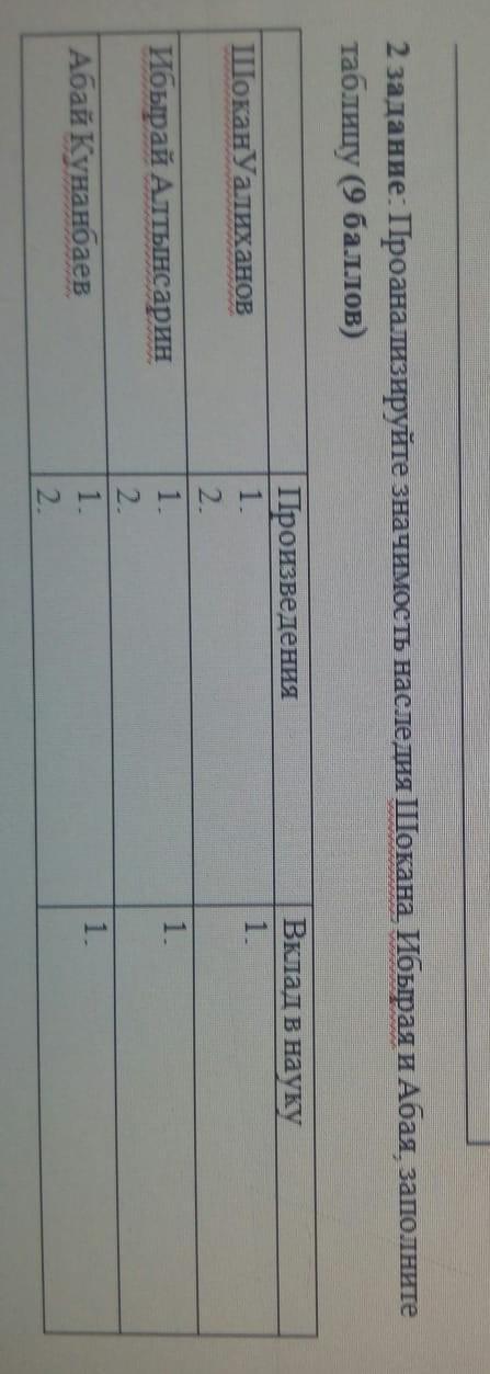ПИШУ СОР ПО ИСТОРИИ КАЗАХСТАНА ОЧЕНЬ ОЧЕНЬ СРОЧНО МОЖНО БЫСТРЕЕ Проанализируйте значимость наследия Шокана , Ибырая и Абая , заполните таблицу