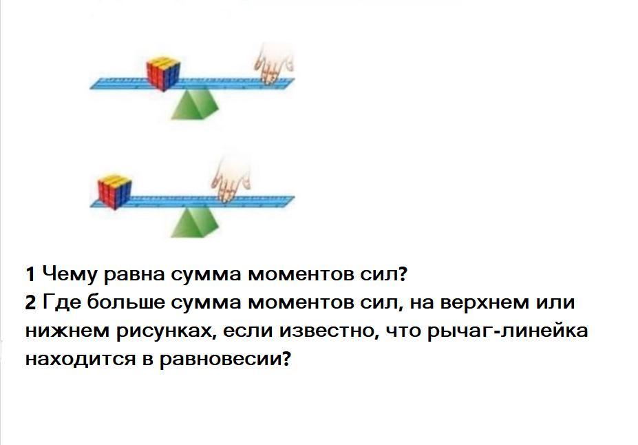 А суммы моментов сил для обоих картинок одинаковы, а, т.к. линейка неподвижна то они равны 0.